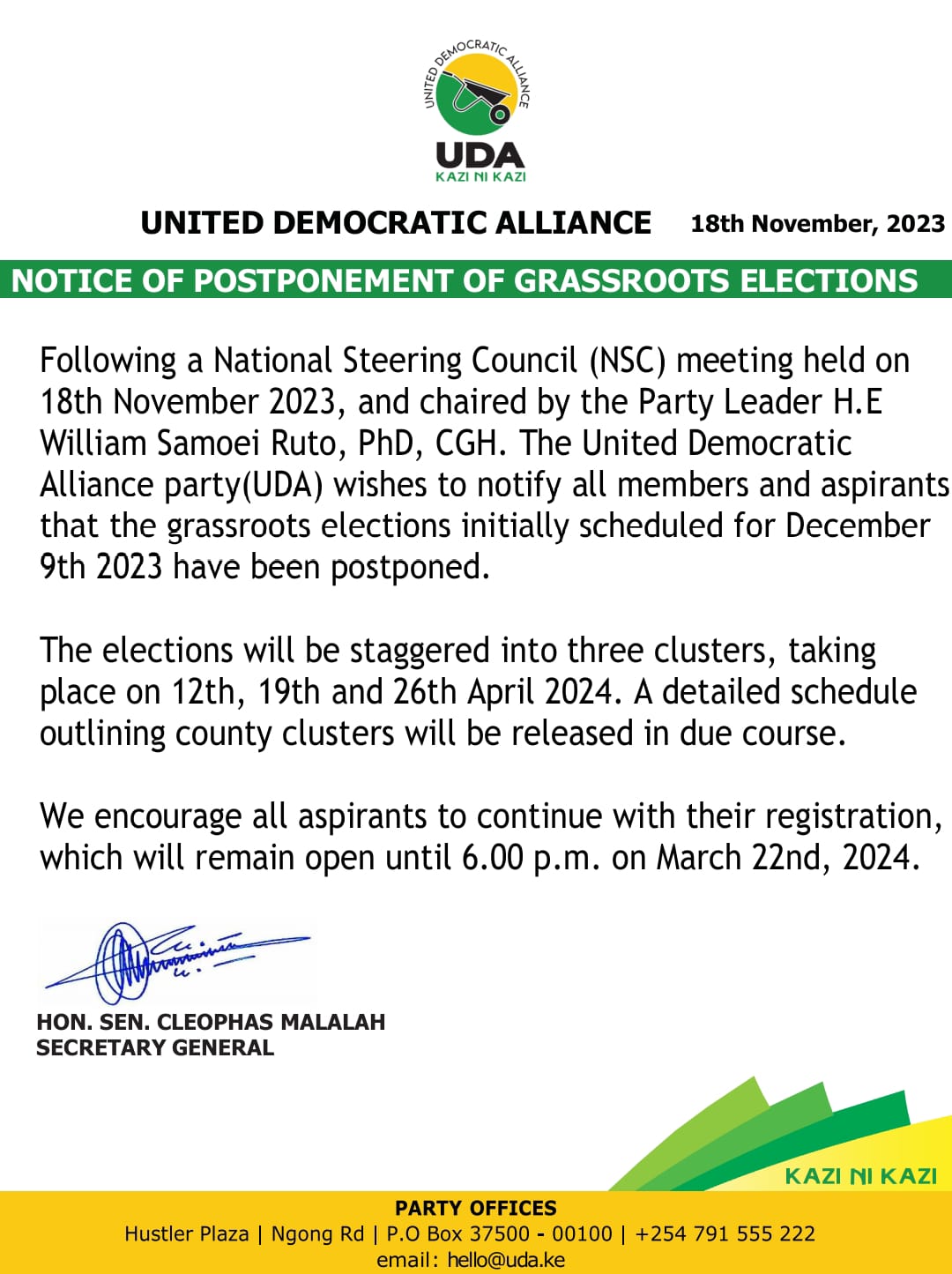POSTPONEMENT OF GRASSROOTS ELECTIONS