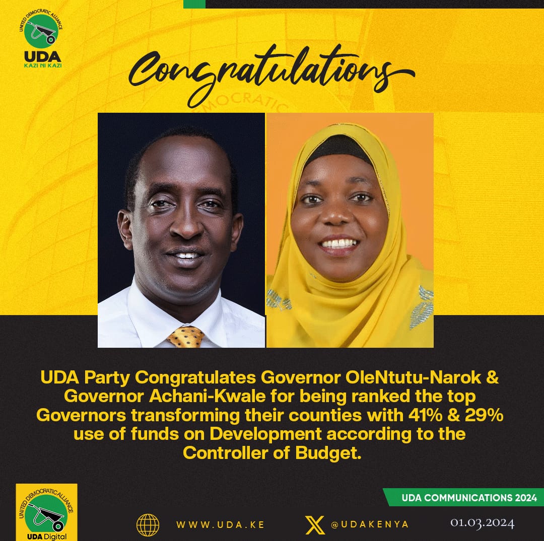 UDA Party Celebrates its elected Governors- Hon. Patrick Ole Ntuntu -Narok and Hon. Fatuma Achani -Kwale for their exemplary work they are doing in their respective counties. The two were rated best in management of their counties , allocating 41% and 29% of the county funds on development programs. This is according to the report of the controller of Budget.