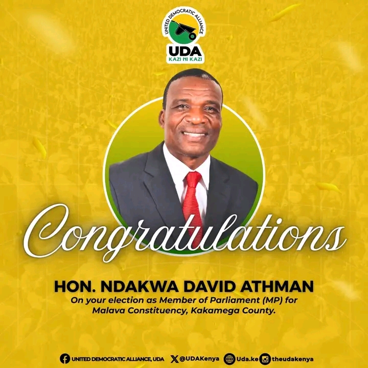 The United Democratic Alliance (UDA) proudly congratulates Hon. Ndakwa David Athman on his emphatic victory as the newly elected Member of Parliament for Malava Constituency, Kakamega County