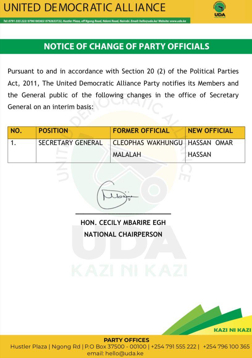 NOTICE OF CHANGE OF PARTY OFFICIALS (SECRETARY GENERAL)